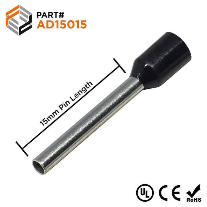 AD15015 - 16 AWG Insulated Wire Ferrules, 15mm Pin, Black, UL Recognized, 500 Pieces