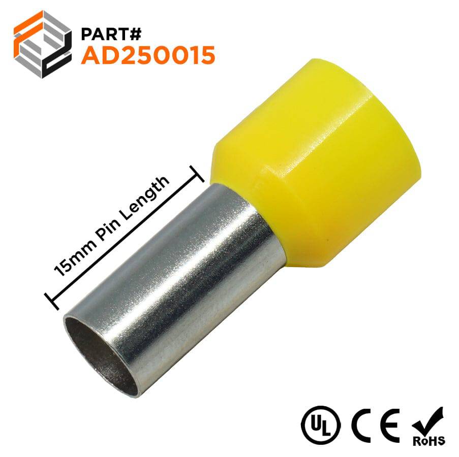 AD250015 - 4 AWG Insulated Wire Ferrules, 15mm Pin, Yellow, UL Recognized, 100 Pieces