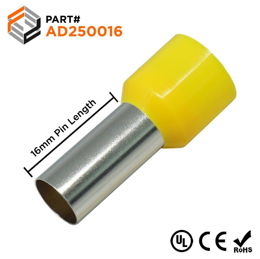 AD250016 - 4 AWG Insulated Wire Ferrules, 16mm Pin, Yellow, UL Recognized, 100 Pieces