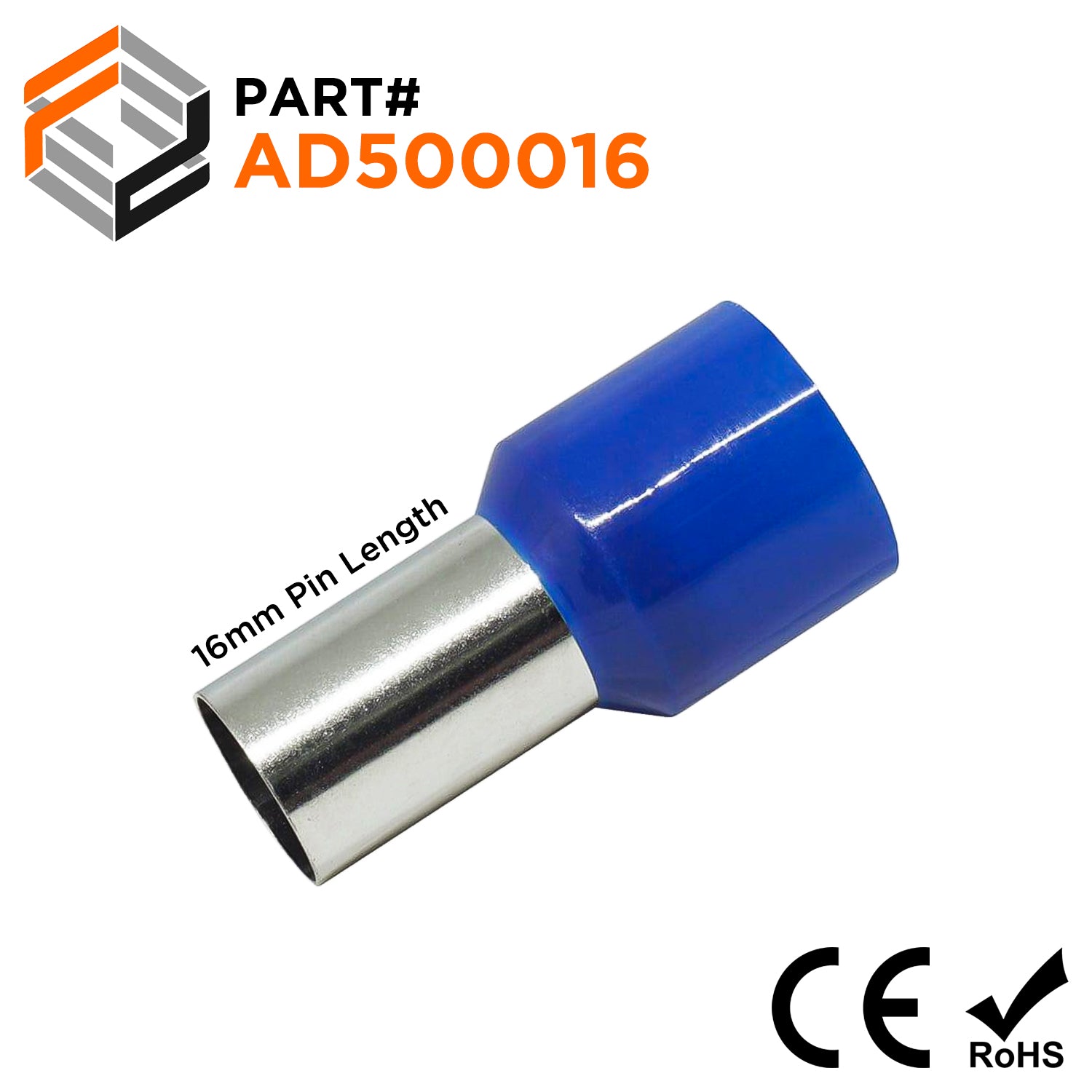 AD500016 - 1 AWG Single Insulated Wire Ferrules, 16mm Pin, Blue, 50 Pieces