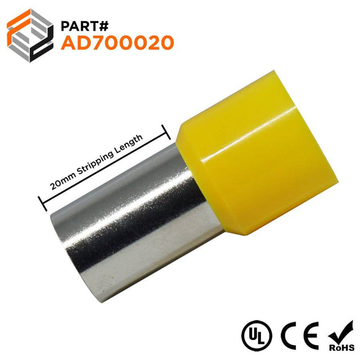 AD700020 - 2/0 AWG Single Insulated Wire Ferrules, 20mm Pin, Yellow, UL Recognized, 25 Pieces