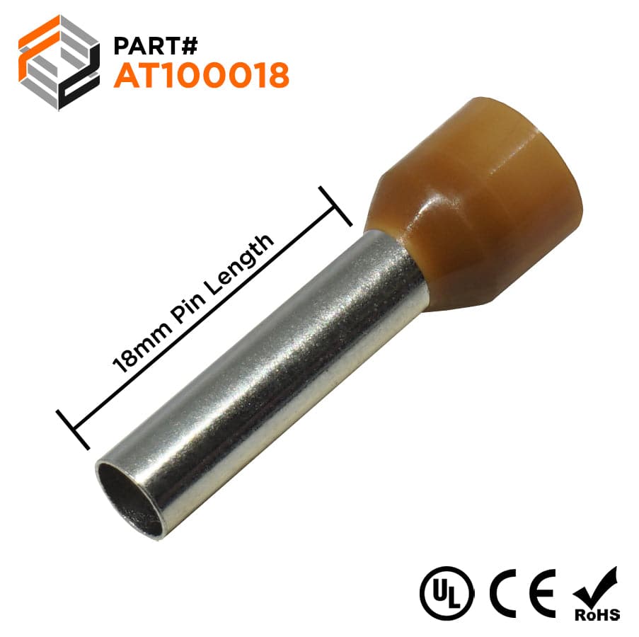 AT100018 - 8 AWG Insulated Wire Ferrules, 18mm Pin, Brown, UL Recognized, 100 Pieces