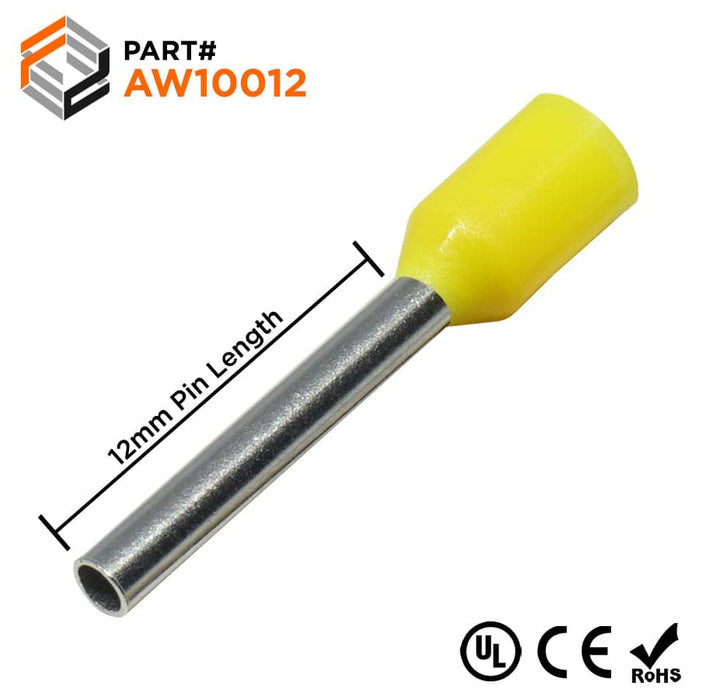 AW10012 - 18 & 17 AWG Insulated Wire Ferrules, 12mm Pin, Yellow, UL Recognized, 500 Pieces