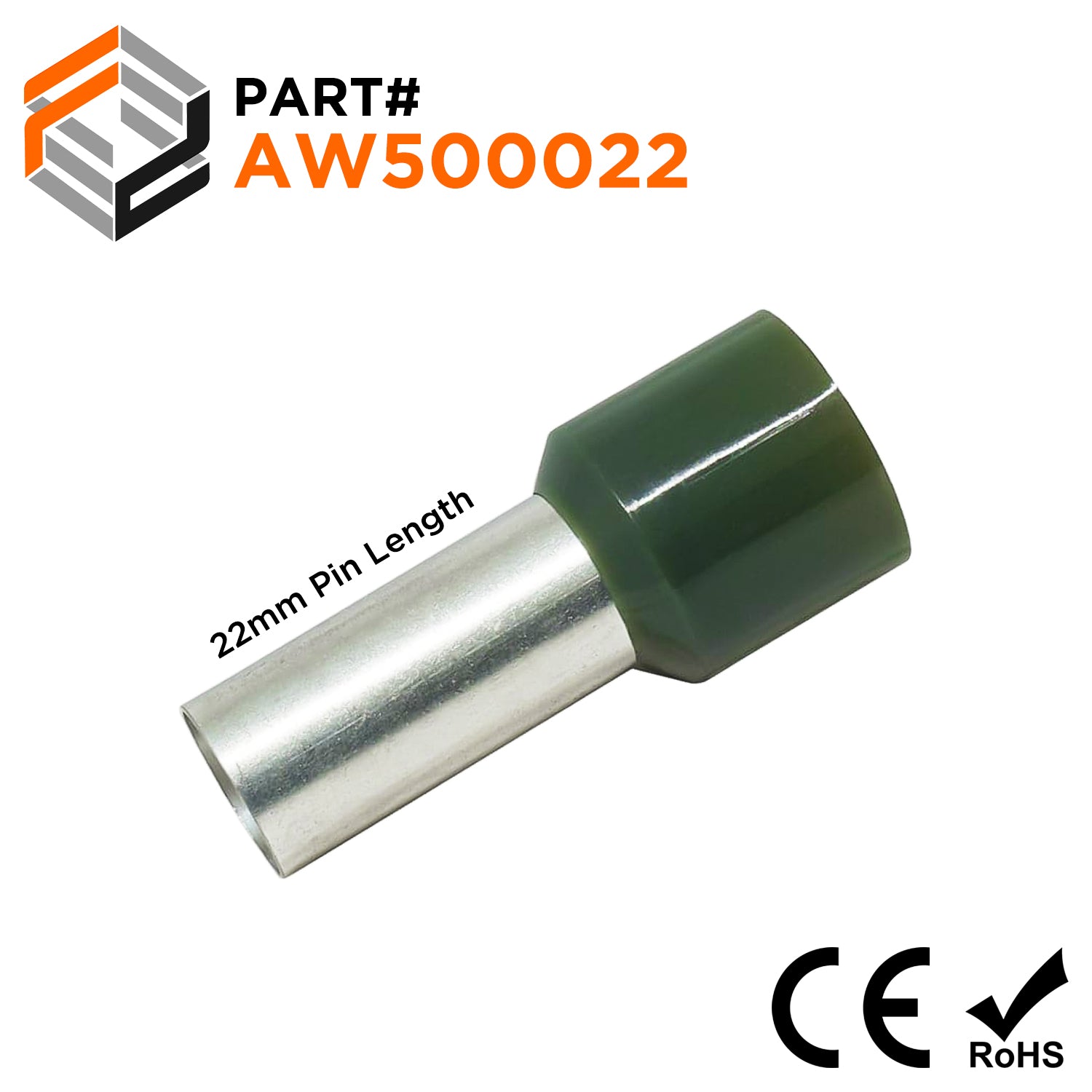 AW500022 - 1 AWG Single Insulated Wire Ferrules, 22mm Pin, Olive Green, 50 Pieces