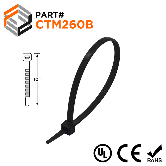 CTM260B - 10" Miniature Cable Ties, 18-lb Tensile Strength, Black, UV Resistant, 100-Pack