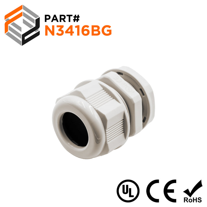 N3416BG - 3/4" NPT Thread Nylon Cable Gland, Beige, Range: 3/8" to 5/8", UL Listed, IP68, IP69K - 1 Piece