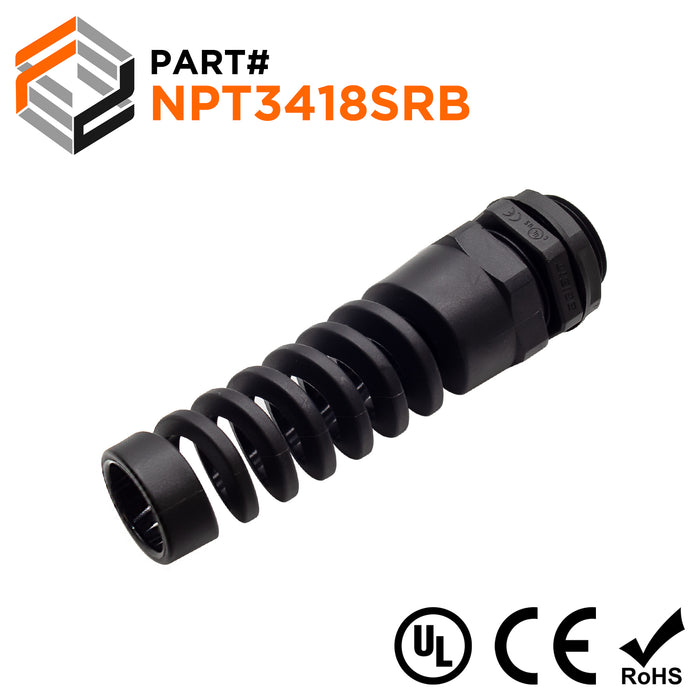 N3418SRB - 3/4" NPT Thread Nylon Flexible Cable Gland, Black, Range: 1/2" to 11/16", UL Listed, IP68, IP69K - 1 Piece