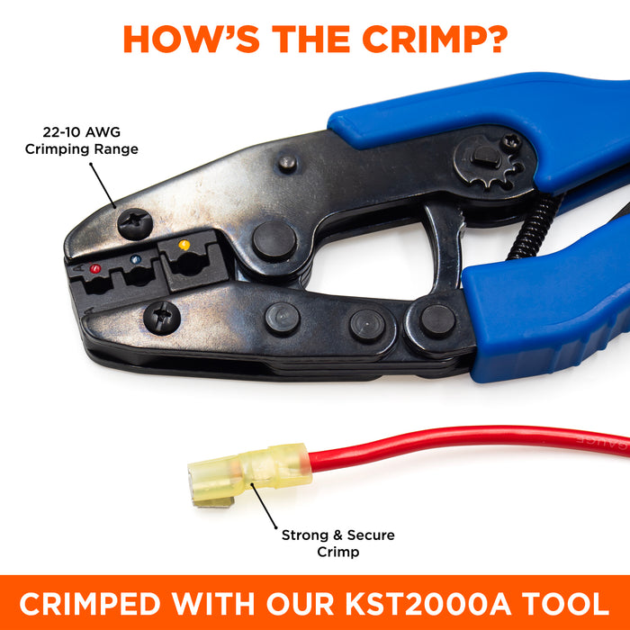 Piggyback disconnects can be used when other male disconnects are limited. It allows another quick disconnect to be connected to its tab. This creates more versatility in points of connection. Multiple connections allow additional circuits to be added to existing equipment without a full rework. Double crimp terminals are built with an additional inner copper barrel which: 1. Substantially reduces the strain on the wire strands. 2. Transfers strain to the wire jacket. 3. Provides a stronger connection. Double crimp terminals prevent wire terminations from becoming loose under stress or pulled out of the terminal, particularly in areas where vibrations are present.