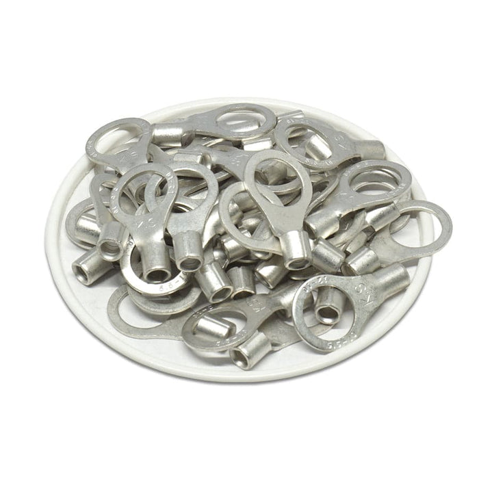 Ring terminals offer a tight and secure connection in high vibration areas. Simply crimp the ring terminals to your stranded wires to be attached to studs or posts. Non Insulated ring terminals come in a variety of sizes and styles in a brazed or butted format. The brazed seam format protects the terminal's barrel from splitting when crimped. These terminals can also be soldered or applied with heat shrink tubing to insulate and protect the connection.