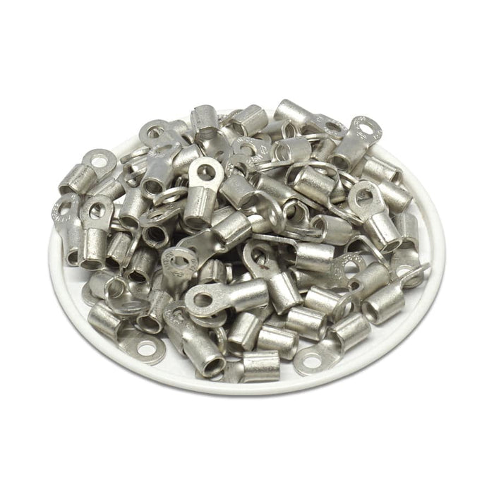 Ring terminals offer a tight and secure connection in high vibration areas. Simply crimp the ring terminals to your stranded wires to be attached to studs or posts. Non Insulated ring terminals come in a variety of sizes and styles in a brazed or butted format. The brazed seam format protects the terminal's barrel from splitting when crimped. These terminals can also be soldered or applied with heat shrink tubing to insulate and protect the connection.