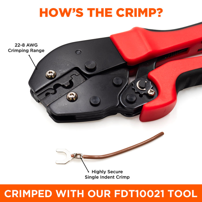 Non-insulated spade terminals lock in place for tight and secure connection in cramped spaces. They allow the user to quickly and easily terminate a connection without the need to remove the fastener. Internal barrel serrations assure good wire contact and maximum tensile strength.