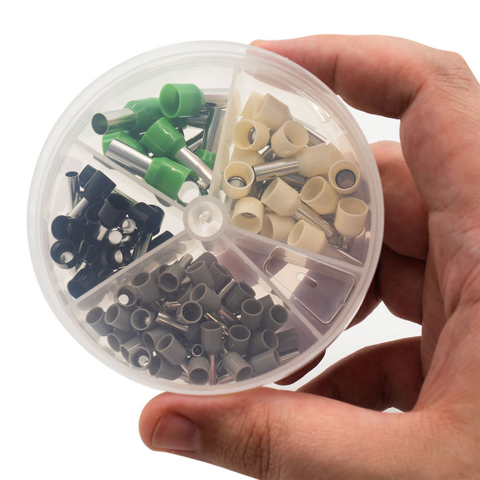 Ferrules Direct's SK1206W wire ferrule mini kit is a pocket sized assortment kit at a very affordable price. The kit includes a 100-piece variety of ferrules ranging from 12 through 6 AWG. Simply pop out the pour tab, rotate the lid to the desired ferrule size, and shake them right out.