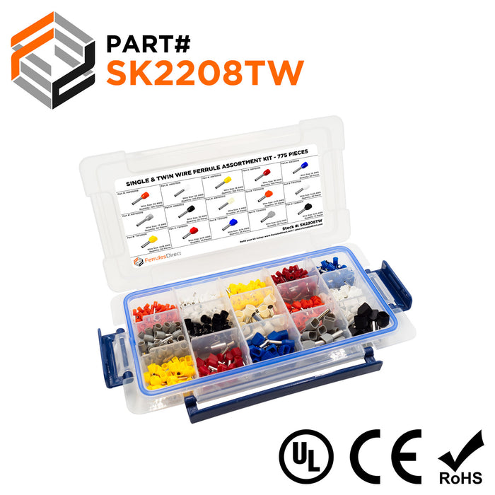 Ferrules Direct's SK2208TW wire ferrules kit is a medium sized assortment kit at a very affordable price. The kit includes a 775-piece variety of single and twin wire insulated ferrules ranging from 22 through 8 AWG. Triple heavy duty clasp lid snaps kit shut with ease. Comes with a high quality heavy duty color label for easy product identification. Please note that the kit dividers are adjustable and can become misaligned.
