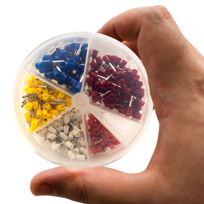 Ferrules Direct's SK2214W wire ferrule mini kit is a pocket sized assortment kit at a very affordable price. The kit includes a 400-piece variety of ferrules ranging from 22 through 14 AWG. Simply pop out the pour tab, rotate the lid to the desired ferrule size, and shake them right out.