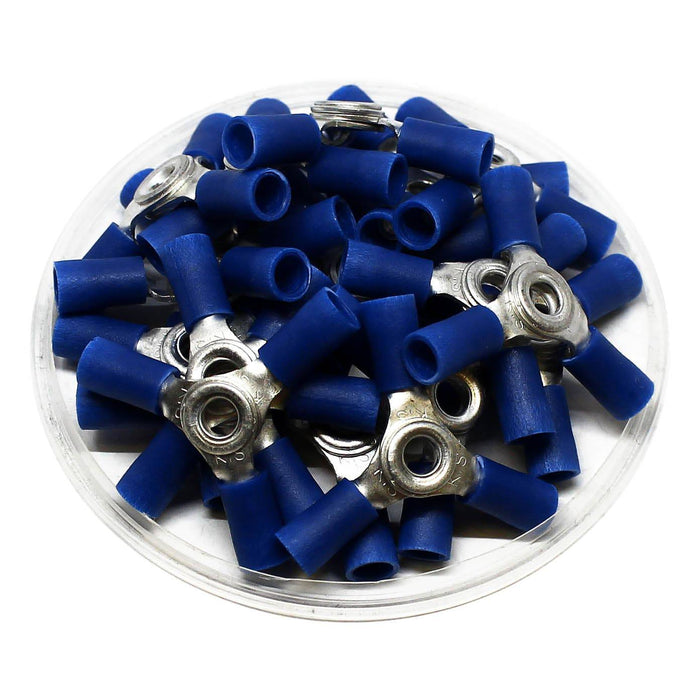 Vinyl PVC 3-Way Connectors (also known as Terminal Splices) securely connect three wires with one terminal. Constructed of three ring terminals riveted together through the stud holes. The vinyl insulation prevents incidental metal to metal contact that can cause shorts. Requires one crimp per wire.