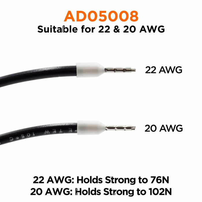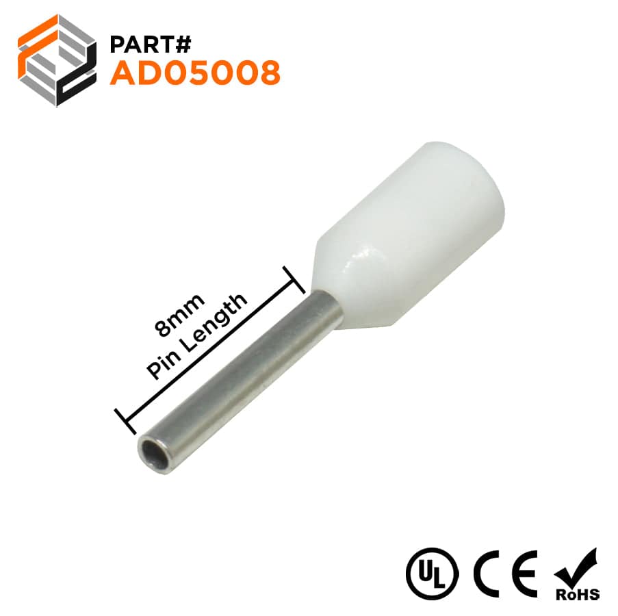 AD05008 - 22 & 20 AWG Insulated Wire Ferrules, 8mm Pin, White, UL Recognized, 500 Pieces