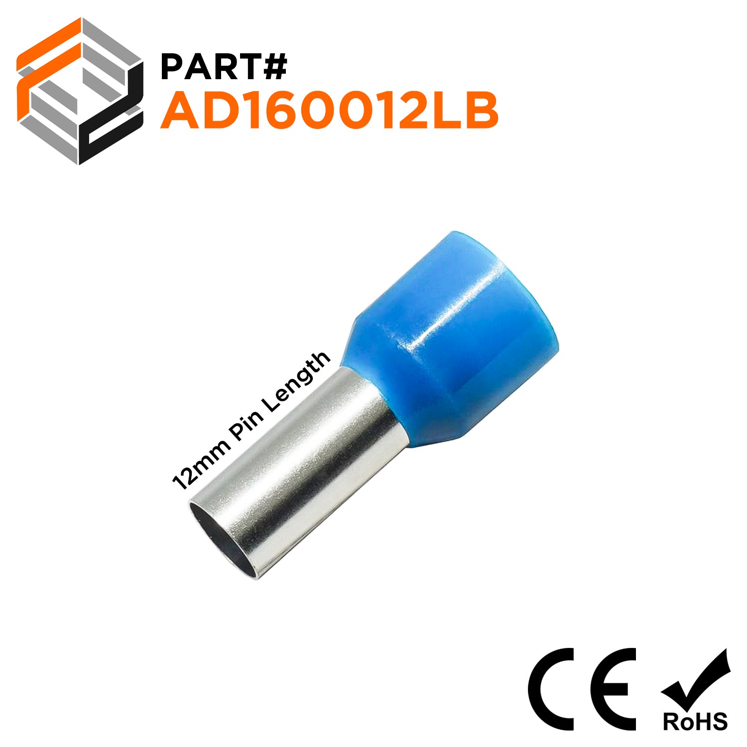 AD160012LB - 6 AWG Insulated Wire Ferrules, 12mm Pin, Light Blue, 100 Pieces