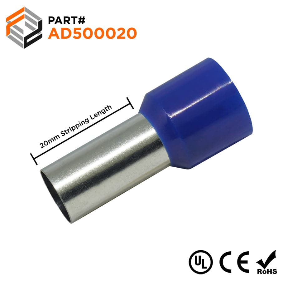AD500020 - 1 AWG Single Insulated Wire Ferrules, 20mm Pin, Blue, UL Recognized, 50 Pieces