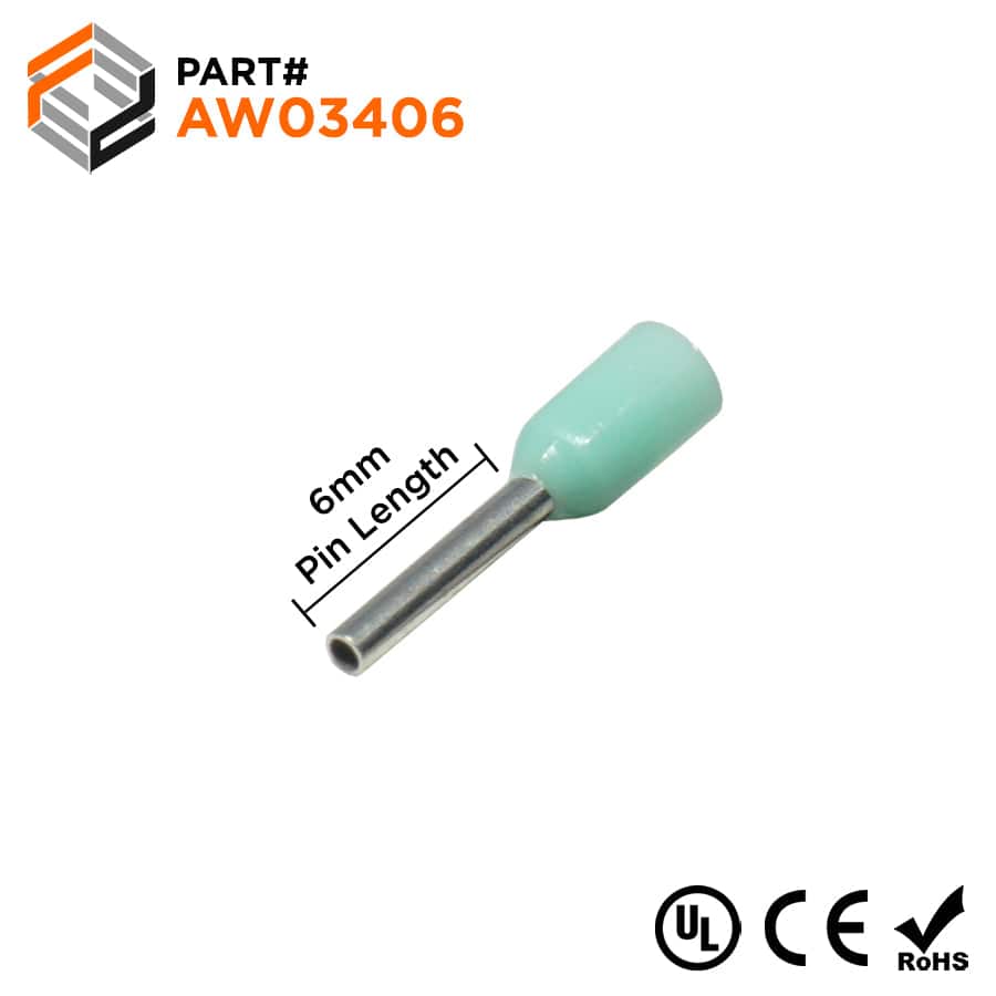AW03406 - 22 & 24 AWG Insulated Wire Ferrules, 6mm Pin, Turquoise, UL Recognized, 500 Pieces