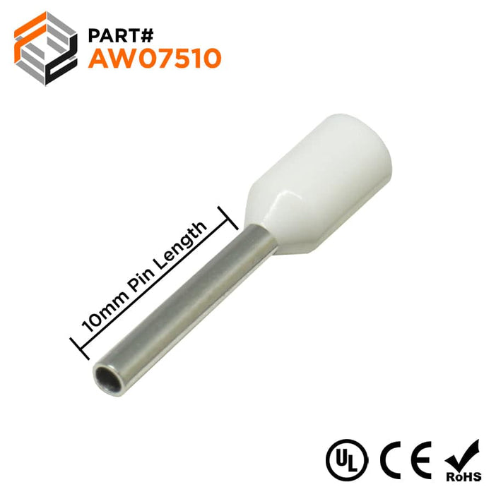 AW07510 - 20 & 18 AWG Insulated Wire Ferrules, 10mm Pin, White, UL Recognized, 500 Pieces