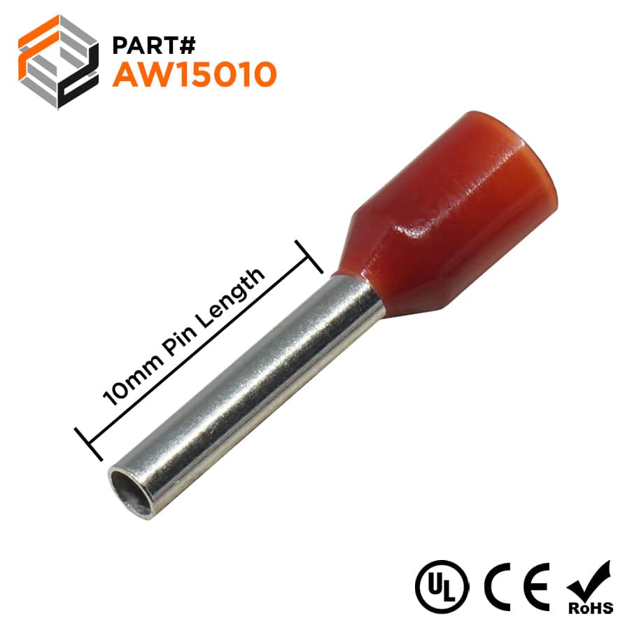 AW15010 - 16 AWG Insulated Wire Ferrules, 10mm Pin, Red, UL Recognized, 500 Pieces