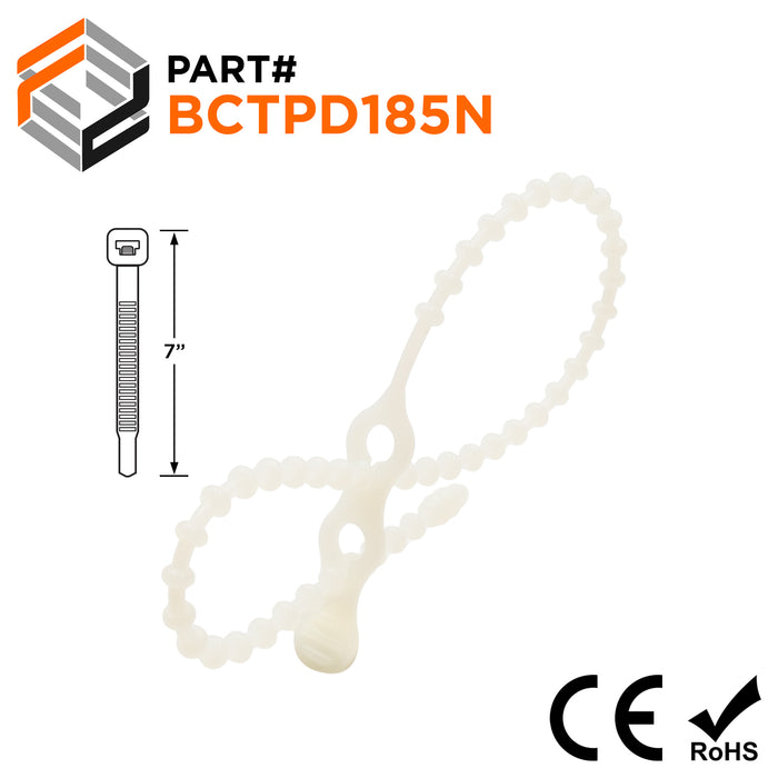 BCTPD185N - 7" Standard Double Loop Beaded Polyethylene Reusable Cable Ties, 35-lb Tensile Strength, Natural, 100-Pack