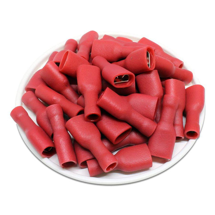 FDFD1-250 - 22 to 16 AWG Vinyl PVC Insulated Quick Disconnects, Female, Fully Insulated, Double Crimp, Red, 100 Pieces