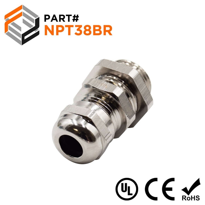 N3808BR - 3/8" NPT Thread Plated Brass Cable Gland, Range: 3/16" to 5/16", UL Listed, IP68, IP69K - 1 Piece