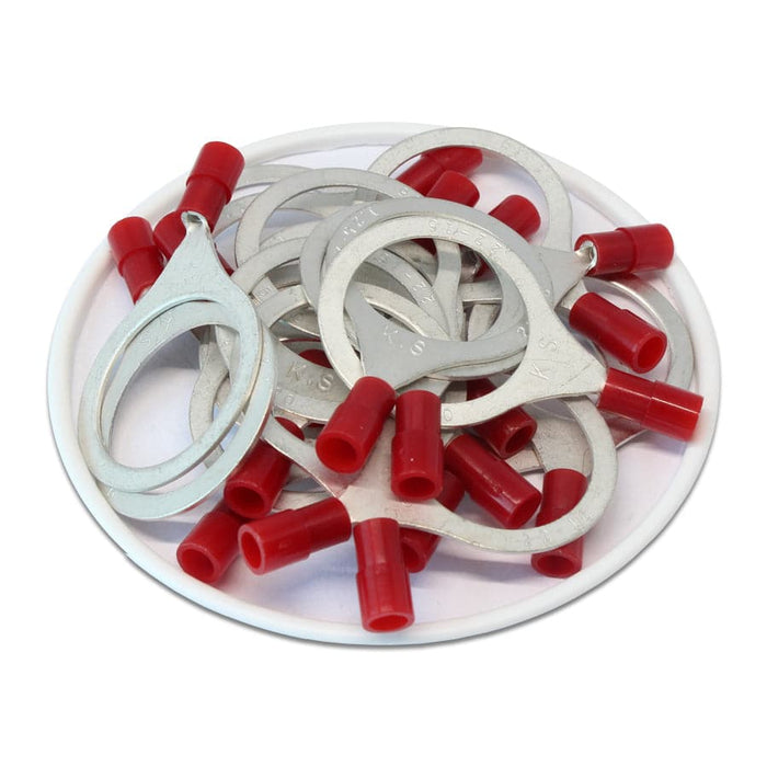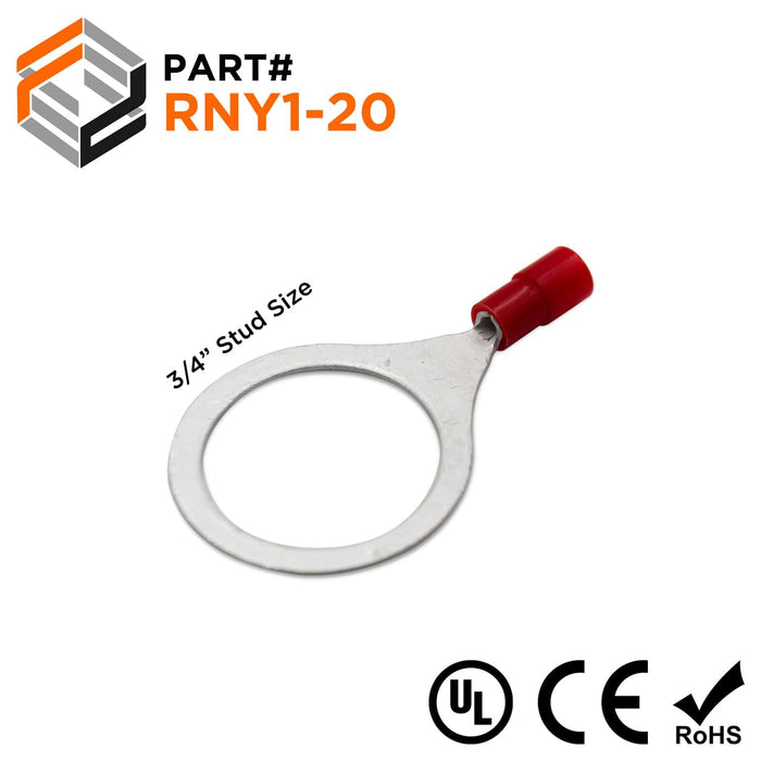 22-16 AWG Nylon Insulated Ring Terminals, 3/4" Stud, Butted Seam, 50 Pieces - RNY1-20