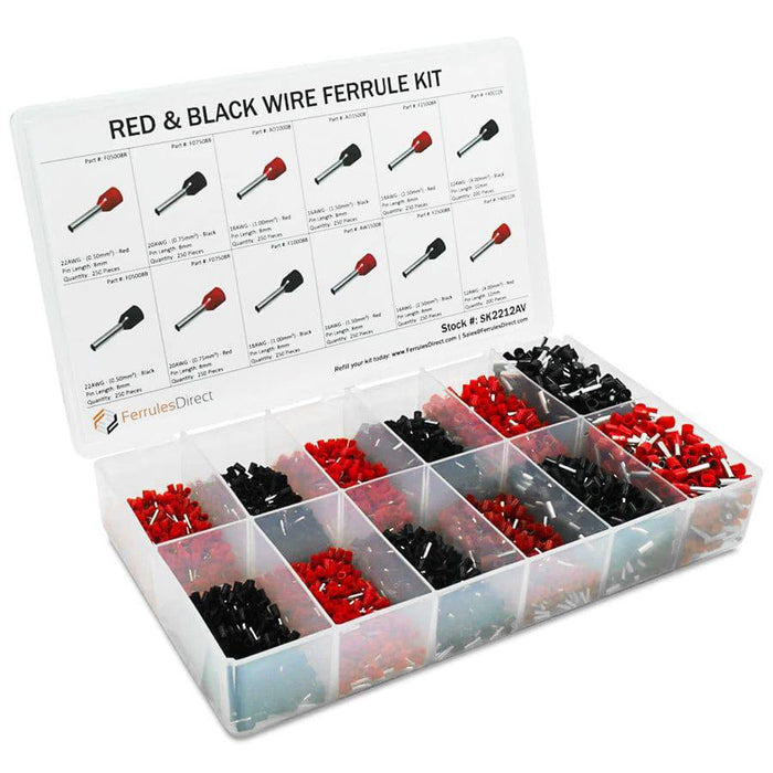 - Description: This convenient Assorted Starter Kit contains a wide variety of red and black Single Insulated Wire Ferrules to suit all your wire termination needs. Perfect for audio connections and low voltage positive and negative runs.