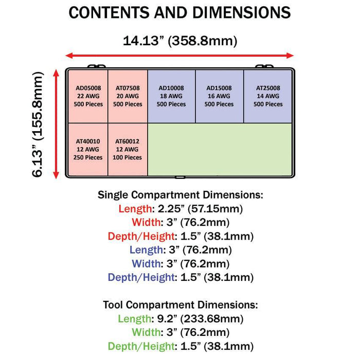 Our basic wire ferrules starter kit comes with a 2,850-piece selection of single insulated wire ferrules from 22 to 10 AWG in the "Series T" color sequence. All of this is housed inside of a heavy duty powder coated steel box with latch and easy-to-carry handle. Kit box dimensions: 14"x6"x1.5" (LxWxH)