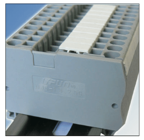The End Cover for UJ5-10 & UJ5-10E Spring-cage Terminal Blocks is designed to aid in electrical isolation at the terminal block's end. This cover features two dimples that enable it to snap securely into position.